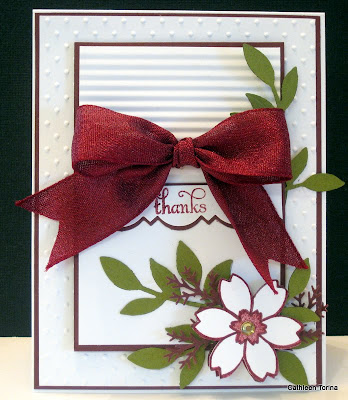 I made this card for this weeks sketch challenge on SCS. The flower image is from Verve Plain Jane, and the sentiment is from the Circular Sayings set. The leaves were cut out with a Quickutz Embosslit die and the ferns are a Martha Stewart punch. The ribbon is from the Paper Source. Thanks for taking a peek!
